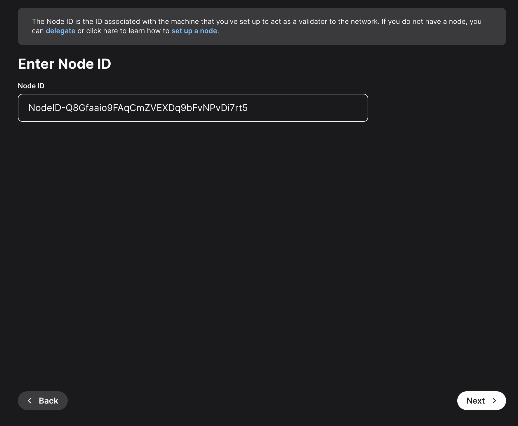Take a note of the nodeID value which is returned as you'll need to use it in the next step when adding a validator via the Avalanche Web Wallet. In this case the nodeID is NodeID-Q8Gfaaio9FAqCmZVEXDq9bFvNPvDi7rt5